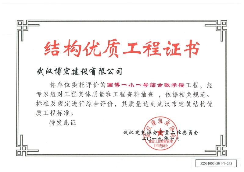 結(jié)構(gòu)優(yōu)質(zhì)工程證書(國博一小一號綜合教學樓)