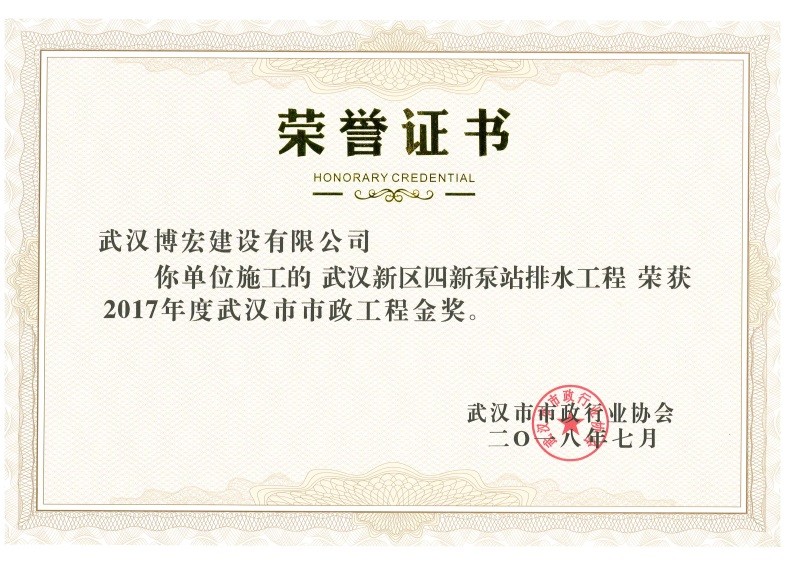2017年度武漢市市政工程金獎(四新泵站排水工程)