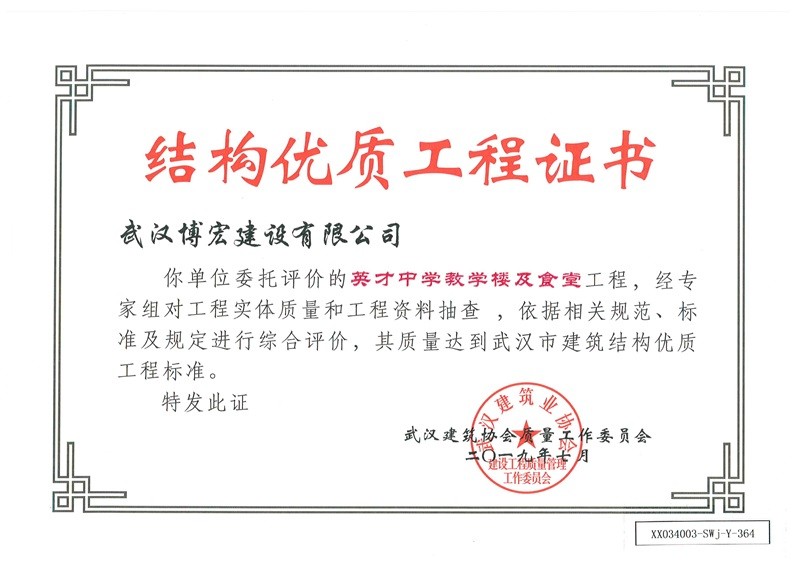 結(jié)構(gòu)優(yōu)質(zhì)工程證書(英才中學教學樓及食堂)