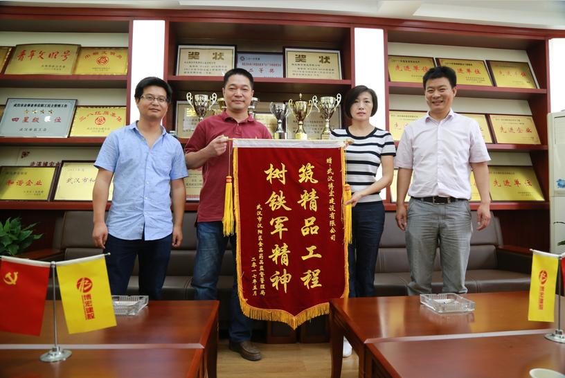 努力成就未來,精品贏得榮譽(yù)!6月14日,因金龍公館4-7樓裝修改造工程建設(shè)又快又好,漢陽區(qū)食品藥品監(jiān)督管理局辦公室主任馬濤專程到訪博宏建設(shè),送來錦旗一面表示感謝!
