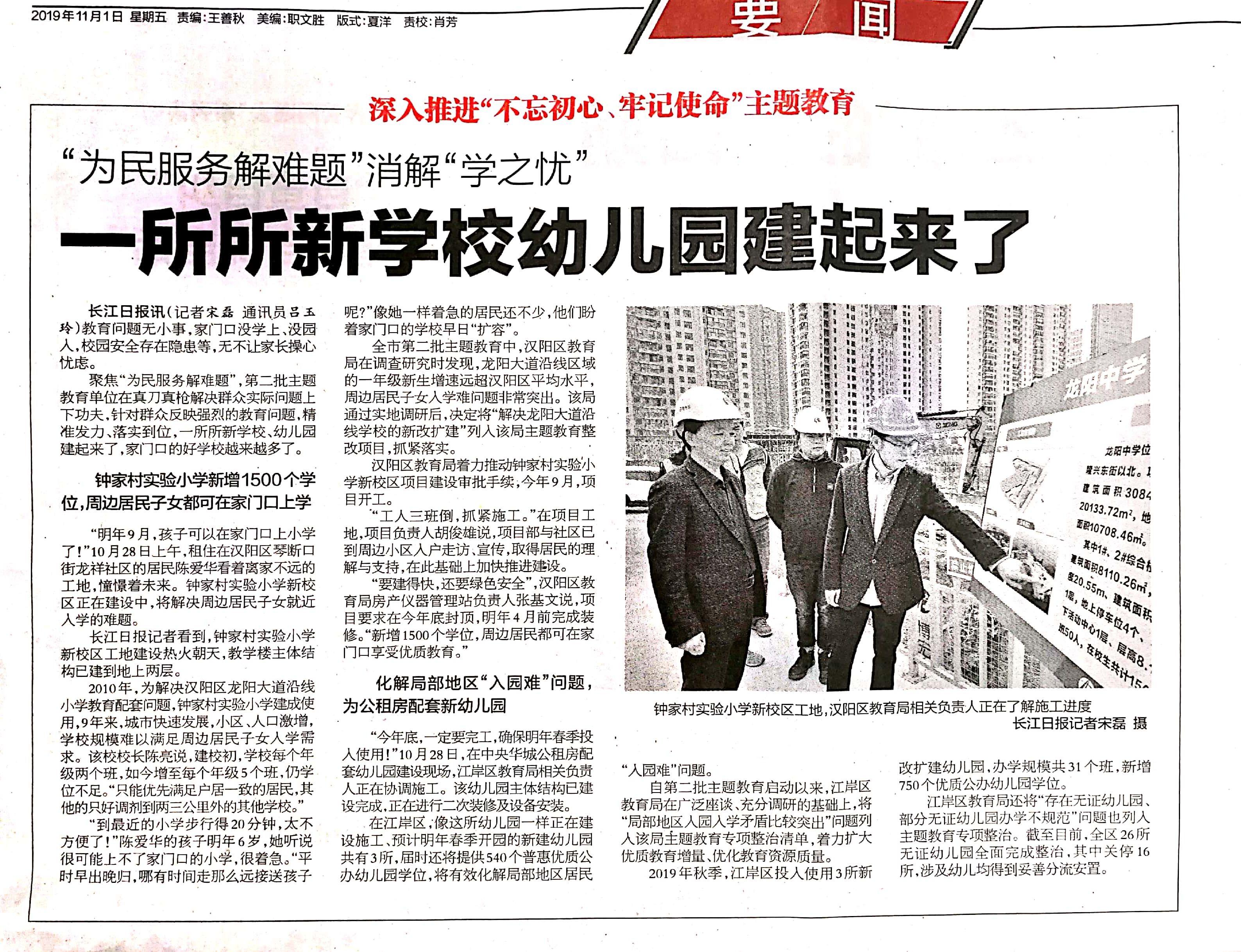 ?????????111日,《長江日報》以“‘為民服務解難題’消解‘學之憂’—一所所新學校幼兒園建起來了”為題,專題報道了龍陽中學項目(該項目建成后35年將作為鐘家村實驗小學新校區(qū)使用)的在建情況和建設意義。