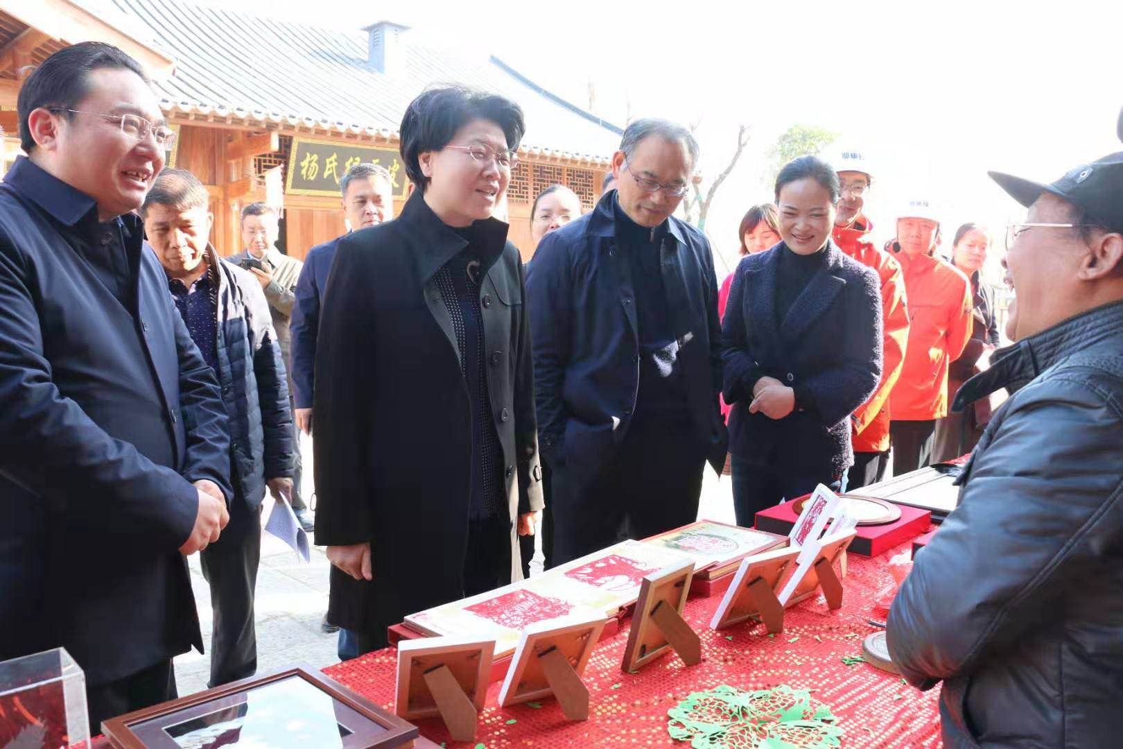 肖菊華一行走進(jìn)項(xiàng)目現(xiàn)場(chǎng),在項(xiàng)目負(fù)責(zé)人的陪同和講解下,參觀了沔陽小鎮(zhèn)迎客廳、商業(yè)街、云野夢(mèng)田服務(wù)中心及樣板間等區(qū)域,并觀賞了沔陽傳統(tǒng)花鼓戲《站花墻》選段,欣賞了沔陽非物質(zhì)文化遺產(chǎn)代表作雕花剪紙、沔陽貝雕、麥稈畫等。肖菊華在考察項(xiàng)目建設(shè)情況的過程中,親切地同文化傳承老藝人進(jìn)行了交流,一方面肯定了老藝人們對(duì)沔陽文化的堅(jiān)守,另一方面對(duì)項(xiàng)目整體設(shè)計(jì)和構(gòu)造所呈現(xiàn)出來的獨(dú)特文化展示平臺(tái)表示了認(rèn)可。