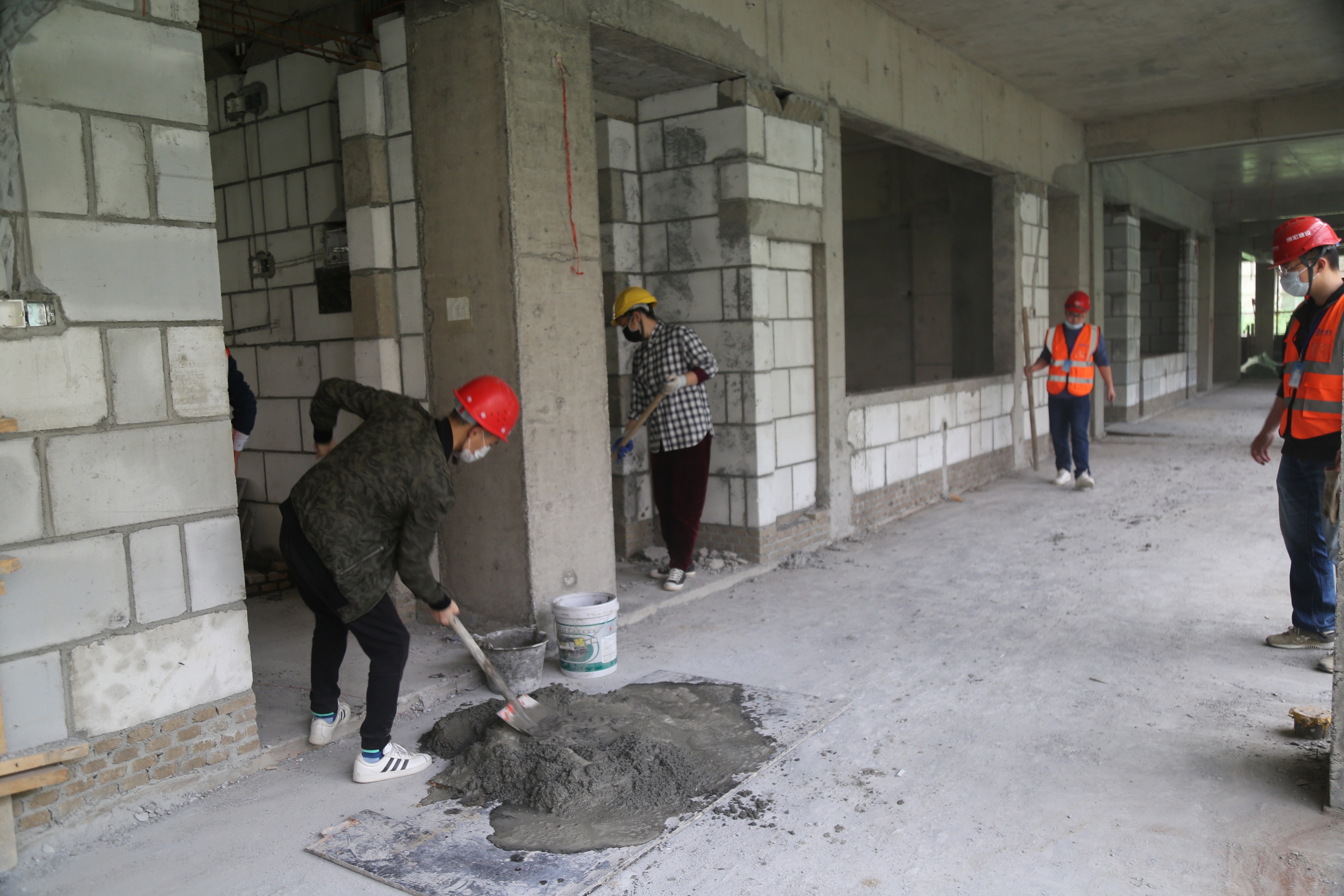 據(jù)項目負責(zé)人介紹,目前龍陽中學(xué)項目已到崗工人60余人,當(dāng)下主要施工任務(wù)是部分樓棟進行內(nèi)架拆除、砌體施工、水電安裝等。在經(jīng)過嚴格的場地消毒、進場測溫和登記等防疫程序后,現(xiàn)場管理人員和工人們陸續(xù)進場,一進場大家就忙活起來了,有的及時對地面凹陷進行覆蓋,有的在上樓為墻面砌筑拌灰,旁邊樓棟里也傳來了“當(dāng)當(dāng)當(dāng)”的鋼管架子拆除聲音。大家對期盼已久的復(fù)工都干勁十足,項目起步就是沖刺,開啟“白+黑”兩班倒模式,已連續(xù)兩個夜晚進行施工,誓要把因疫情耽誤的工期盡快趕上。