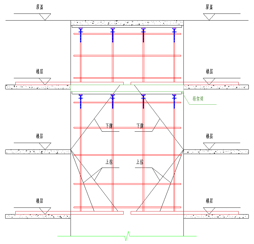 該技術通過采用兩道16#工字鋼懸挑(一道布置在屋面層,一道布置在屋面層-2層),分別設置下撐及上拉的方式搭設支撐平臺,再利用此平臺為基礎搭設支撐架和外腳手架,既用于結構施工,同時兼作安全防護,有效降低了操作人員的安全風險,對結構安全性有較大保障。