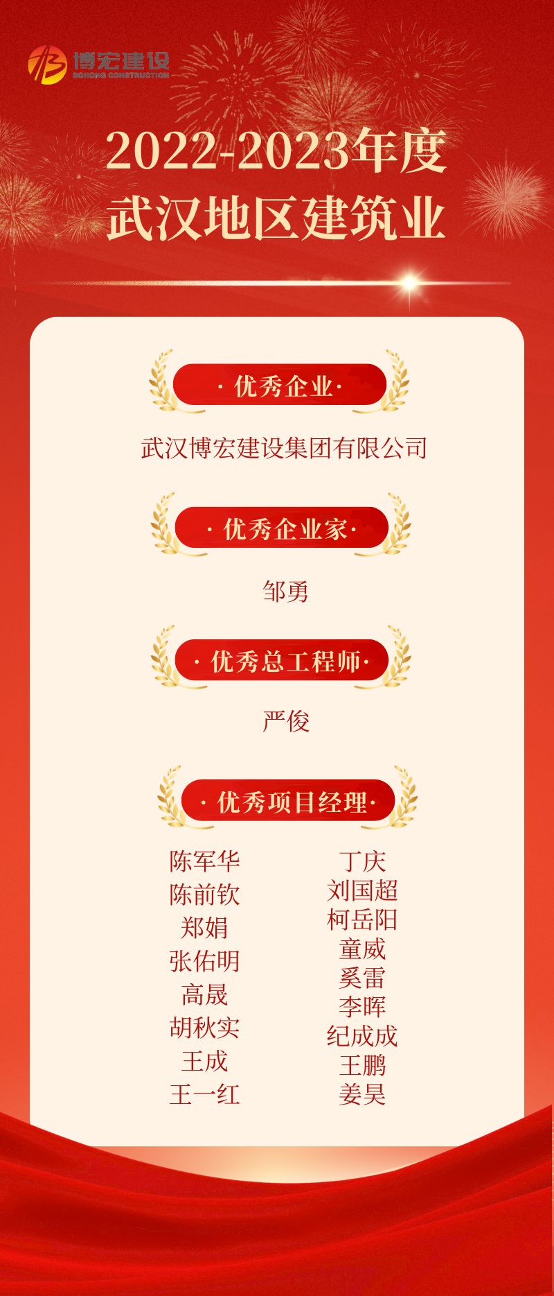 近日,2022-2023年度武漢地區(qū)建筑業(yè)優(yōu)秀企業(yè)、優(yōu)秀企業(yè)家、優(yōu)秀總工程師、優(yōu)秀項(xiàng)目經(jīng)理選樹結(jié)果正式發(fā)布,博宏建設(shè)集團(tuán)喜獲“大豐收”,獲評1項(xiàng)優(yōu)秀企業(yè)、1人獲評優(yōu)秀企業(yè)家、1人獲評優(yōu)秀總工程師、17人獲評優(yōu)秀項(xiàng)目經(jīng)理!